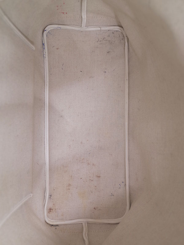角にスレ、コバにヒビ・裂け、キャンバスに黒ずみ、内側に汚れ・ペン跡あり。